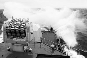 ——2002年5月至9月,中國海軍艦艇編隊首次環球航行,共穿越15條著名海峽水道,橫跨68個緯度,6次穿越赤道,訪問10個國家和港口,總航程33000海里。至此,中國海軍艦艇編隊壯游三大洋。同時,一個新的重大轉折也在悄然完成。軍艦走出國門,開始從單純航渡出訪,轉變為遠航訓練結合出訪,甚至是以訓練為主。征服遠海大洋的能力,體現著一支現代海軍的訓練水平。1980年10月,南海艦隊艦艇編隊,首次出巴林塘海峽到太平洋遠航訓練。經過海峽西口的“魔鬼三角洲”時,因缺乏經驗,一艘軍艦上的10名艦員被巨浪打下大海,2人遇難。這是人民海軍走向大洋付出的血的代價。此后,海軍遠航編隊經驗越來越豐富,不畏暗礁險灘,勇闖驚濤駭浪。在南中國海,戰艦遭遇狂風巨浪,重達1噸的鐵錨被風浪掀上甲板;在太平洋,編隊遭遇持續半個月之久的大風浪,滿載排水量為數萬噸的補給艦強烈震顫,逆風頂浪,頑強前進;在比斯開灣,編隊遭遇12級大風,艦體左右搖擺近30度,艦艉螺旋槳多次露出海面……20多年過去,人民海軍遠航訓練已經發展成為一種常態:每年有上百艘次水面艦艇駛向遠海大洋,晝夜連續航行從數百海里到數千海里,潛艇水下隱蔽待機由數十天到數月,航空兵長途奔襲由一般氣象條件到復雜氣象條件,上千艘次艦機在太平洋海域進行多課目訓練。