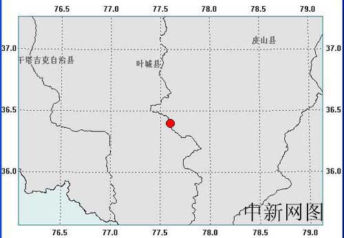 中新網葉城5月21日電 據國家地震臺網測定,北京時間2009年05月21日20時33分,在新疆維吾爾自治區喀什地區葉城縣、和田地區皮山縣交界處(北緯36.4度,東經077.6度)發生5.2級地震,震源深度約96公里。