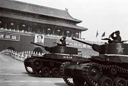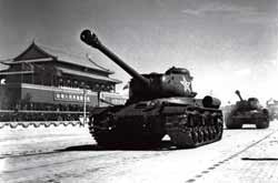 朱德總司令由聶榮臻司令員陪同乘車檢閱陸海空三軍。分列式開始后,戰車方隊約在3點半發動車輛,并以嚴整的隊形和每小時15公里的速度通過天安門,接受檢閱。一百多輛戰車通過天安門時,恰與空中戰鷹編隊同步,場面顯得恢宏壯觀,大氣磅礴。