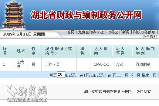湖北省財政與編制政務公開網工作人員告訴記者,湖北省推行的是“陽光編制”,只要發生人事變更,該網便會在第一時間更新數據。11日上午10時,記者發稿前,王秉鋒的姓名仍掛在湖北省財政與編制政務公開網上,所屬單位為紅安縣國土資源局。(記者張揚)