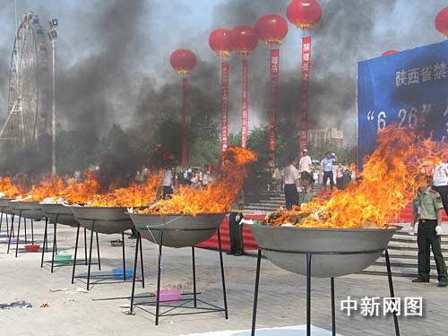 中新網(wǎng)西安6月26日電(記者 冽瑋)6月26日是第22個(gè)國(guó)際禁毒日,今年的主題是“依法禁毒 構(gòu)建和諧”。今天上午,陜西省禁毒委在咸陽(yáng)市統(tǒng)一廣場(chǎng)公開(kāi)集中銷(xiāo)毀繳獲的313公斤毒品。