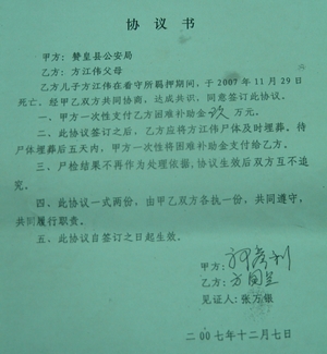 7月1日本報(燕趙都市報)刊發的《疑犯被逼喝涼水致終身殘疾》如一石擊水,讓"牢頭獄霸"、"躲貓貓"、"喝涼水"再次成為社會關注的焦點。而令人震驚的是,在調查秦英偉"喝涼水"致殘案過程中,本報記者又有驚人發現:同是贊皇縣看守所,2007年4月至11月半年多時間內,兩個在押疑犯暴斃,最后都由當地公安部門出錢"協商解決",一位死者家屬給了"困難補助金"9萬元,另一位死者的家屬給了1.5萬元。