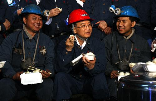 臨近中午12時,從早上7時就下到礦井里工作的工人們要吃中飯了。在巷道里,溫家寶坐在枕木上與工人們一起用餐。他一邊吃飯,一邊詢問工人們的生產生活情況。他對大家說,中國是世界上最大的產煤國,應該有世界上最先進的礦井、最先進的技術和設備、最優秀的產業工人。在應對國際金融危機時,一定要把煤炭生產搞好。必須正確處理保增長與安全生產的關系,任何時候安全生產都是第一位的,在安全生產中實現經濟平穩較快增長。同時,要下決定引進新技術,大力推進清潔生產,讓煤炭生產質量和效益走在世界的前列。溫家寶在礦井下呆了兩個小時,才與礦工們惜別。