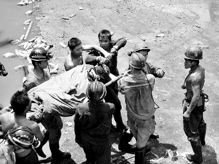 11時35分,施救人員把堵塞該巷道的淤泥和煤塊清開,發現里面有3名被困的工人,而且這3名工人還能說話,意識也是清醒的。施救人員立即用黑布將3人的眼睛包裹住,然后每8名救援人員用擔架抬起一名被困者,慢慢將他們送至井口。此時,早已聞訊的醫務人員來到井口,分別為3名礦工輸液,以保持生命體能。
