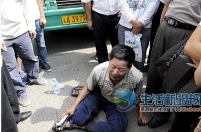 一名50多歲的男子擋在一輛77路公交車前,坐在地上痛哭,民警怎么勸說他也不愿意離開。男子稱:“這些城管太不講道理了,他們快把我的兒子打死了。”據該男子介紹,20多名城管人員昨日早上將其兒子打傷,兒子被送進醫院搶救,而打人的城管全部跑了,“實在是沒有辦法,我兒子不能白白受罪,無奈之下,我只能通過這種方法引起相關部門的重視。”