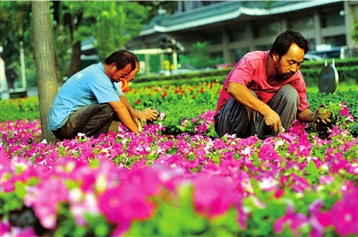 昨天,在交通部對面的綠化帶里,20多位園林綠化工人正在修剪枝椏,空地上擺滿了小花盤,紅黃綠紫,顏色多樣,引來眾多市民觀看。市園林綠化局透露,根據國慶60周年北京花卉景觀布置規劃,全市將布置各類花卉共達4000萬盆。其中,天安門廣場將在十一期間設置一組中心花壇,長安街沿線步道將布置22處立體花壇,面積達十萬余平米。其中,天安門廣場中心花壇作為主花壇,現暫定將安排在天安門中心廣場偏南10米的位置,呈圓形,突出“普天同慶”的主題;▔睆綄⑦_40米,中心主花籃高達13米,將選用真假花卉結合的方式,主選花種有粉矮牽;、小黃菊等。市園林綠化局負責人表示,主花壇的設計和布置還未最終確定,將在國慶游行排練之后,按實際需要做相應的修改和調整。