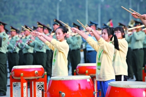 昨日下午3點開始,聯合軍樂團和合唱團、民族打擊樂團共4000余人在聯合軍樂團駐地進行了合練。記者在現場看到,廣場樂聲悠揚,氣氛熱烈。一些大學生合唱團成員從各自高校乘大巴趕至郊外,有些學生暈車剛吐完就上場加入合練。