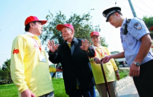 “奧運會舉行時,傅老就是治安志愿者!蔽鞑菔猩鐓^民警趙亮說,今年一聽說國慶安保也需要志愿者,傅漪泉老人一早兒就報名參加了。為了照顧老人身體,民警都沒給他固定崗位,但“老人常主動在胡同里轉!壁w亮還表示,去年除夕傅漪泉老人夜里12點出來巡邏,發現西草市社區148號附近的堆積物上有火苗,趕緊回去告訴家人。家人立即通知趙亮處理,避免了一場火情。
