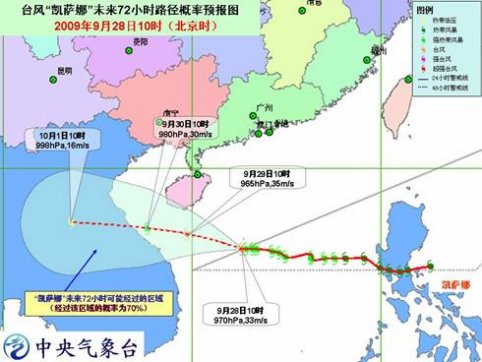預計,“凱薩娜”將以每小時15公里左右的速度向西偏北方向移動,強度還將有所加強,并逐漸向海南南部沿海靠近,將于29日經過海南南部近海后,向越南中北部沿?拷
