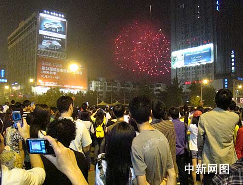 當晚8時,早已準備就緒的禮花彈在成都市區內6個燃放點同時升空,綻放的焰火無比璀璨,給成都夜空披上了一件華麗的袍子。成都民眾紛紛走出家門,來到自家的樓頂或聚集在鬧市區,共賞了這臺慶祝新中國60華誕的焰火“盛筵”。