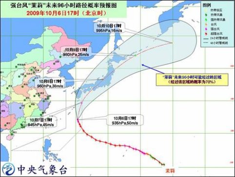 預計,“茉莉”將以每小時25公里左右的速度向偏北方向移動,7日將轉向東北方向移動,強度趨于減弱,并逐漸向日本中部沿海靠近。