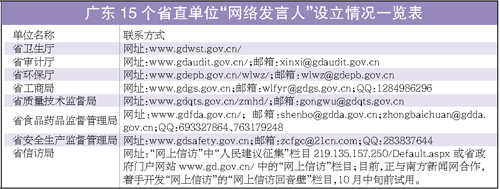 (廣東)省委辦公廳第二次網友集中反映問題交辦會要求首批設立“網絡發言人”的l5個省直單位,至昨天已全部設立“網絡發言人”,并開始履行職責。這標志著廣東在建立網絡發言人制度上邁出實質性步伐。