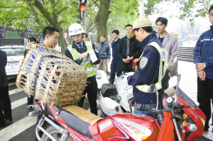 由于交警高密度檢查,摩托車上的遮雨傘被紛紛摘除,不過,焊接的鐵管大多沒拆。昨上午,就有3輛摩托車為此受罰。