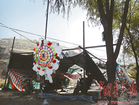 10月20日上午11時(shí)許,山西省呂梁市臨縣林家坪鎮(zhèn)白家峁村。村口不遠(yuǎn)靠近公路的空地上,有幾個(gè)用棚布搭起的簡(jiǎn)易帳篷,有的被燒得只剩下幾塊破布,在秋風(fēng)中無(wú)力地?fù)u曳著。這是幾個(gè)月前村民為護(hù)礦搭起來(lái)的,現(xiàn)在成了村民郝兔照的靈堂。他的棺材已經(jīng)在這里放了8天,旁邊擺放著花圈、供品。
