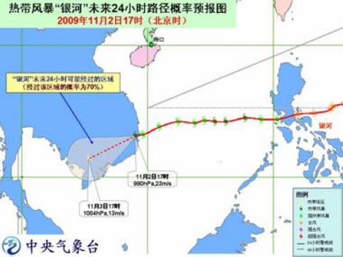 中新網11月2日電 中央氣象臺2日18時發布臺風預報:今年第21號強熱帶風暴“銀河”的中心已于2日16時前后在越南富安省(PhuYen)與慶和省(KhanhHoa)交界附近沿海登陸,登陸時中心附近最大風力有10級(25米/秒),中心最低氣壓為985百帕。登陸后,“銀河”減弱為熱帶風暴,17時其中心位于越南慶和省境內,就是北緯12.8度、東經109.1度,中心附近最大風力有9級(23米/秒),中心最低氣壓為990百帕。