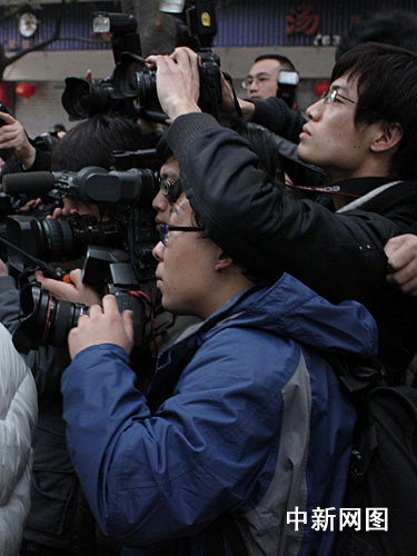 2日,在重慶市第五中級人民法院門口采訪的記者們。 中新網發 郭虹 攝