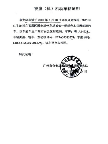 該博文還附了幾張文件的掃描圖作為證明。一張成交日期剛好是2005年5月20日的由番禺區(qū)國土房管局開出的《契稅完稅證》,納稅人為“駱×”,房地產(chǎn)位置為錦繡香江花園××園×街×號;一張六天后廣州市國土房管局開出的同處房產(chǎn)的《房地產(chǎn)權(quán)情況證明》,權(quán)屬人為“駱×”,但備注注明共有人為韓××及駱志斌;一張廣州市公安局番禺分局刑警大隊開出的《被盜(搶)機動車輛證明》(見左圖),上寫駱志斌于2005年5月20日到該分局報案稱,本田雅閣汽車當天在番禺區(qū)國土局停車場被盜。網(wǎng)友注明,“駱×”為駱志斌的公子。另外,網(wǎng)友還附了一張房產(chǎn)圖片,稱錦繡香江花園同樣位置的別墅在2006年已賣到每平方米3萬元。