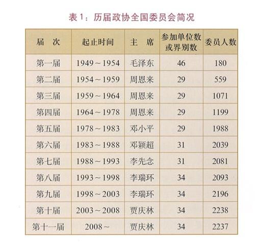 政協(xié)全國委員會(huì)每屆任期五年,設(shè)主席、副主席若干人、秘書長。歷屆政協(xié)全國委員會(huì)簡況如表1。