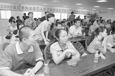 2009年8月26日,福建省廈門市,2009年秋季外來務工人員子女就讀公辦小學派位現場,家長焦急地看著派位結果。廈門市思明區和湖里區舉行秋季公辦小學一年級招收進城務工人員子女入學的電腦派位。兩區共計有3142名進城務工人員子女被派入公辦小學。