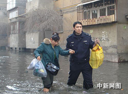 大量的融雪性洪水向倉房溝村一帶低洼處涌積,致使土柸結構的居民住房被洪水浸泡,有垮塌之險。另一處的大量洪水涌入近處一棟居民樓,民警立即組織警力進入樓內進行施救,挨家挨戶動員居民撤離住所,并攜老扶幼將婦女兒童帶離危險地帶。