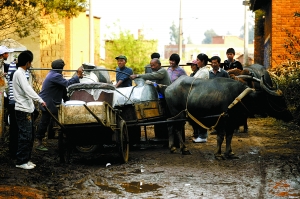芳華鎮雙合村口,朱家付牽著牛車擠在人群中。黃牛拉著一個銹跡斑斑的鐵桶,那是全家用水的希望。抽上來的水不時的灑到人們身上,孩子們嬉笑著。