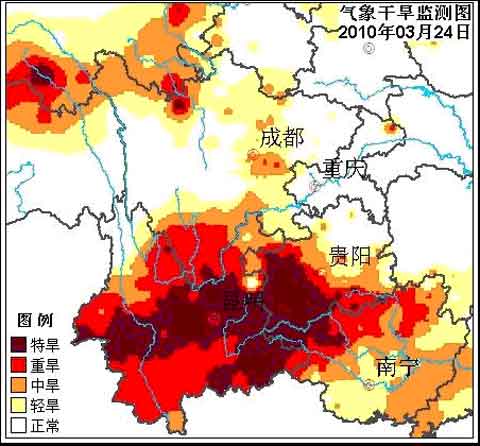3月24日氣象干旱監測顯示,云南大部、貴州西部和南部、廣西西部和北部、四川南部等地存在中度以上氣象干旱,其中云南除西北部和東北部的其它大部地區、貴州西南部、廣西西北部等地存在重度以上氣象干旱。