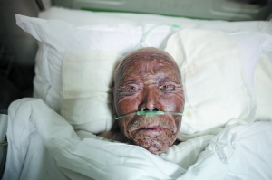燒傷后的臉龐已成碳色,身上布滿紗布,焦煳味仍舊可聞。