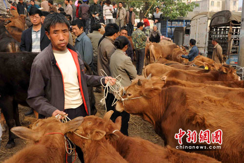 秦大章夫婦看上了馮元達(dá)一頭不到兩歲的小牛,“沒換牙齒、蹄也不錯。”秦大章很內(nèi)行的告訴記者。在此后近30分鐘的時間里,一場在2300元至1900元人民幣之間的價錢拉鋸戰(zhàn)進(jìn)行起來。最終,在周邊人的撮合下,秦大章以2010元的價錢買到了他看上的小牛。