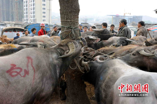 近中午時間,市場里買賣的人群還未散去。秦大章夫婦牽著剛買的牛回家了,這得花上2、3個小時的時間。回到家,喂牛的水又是一個問題,“沒干凈水夠它喝,只能像鄰居那樣把洗菜、洗臉腳的水留下給牛喝。”秦大章的妻子說。雖然羨慕村里有人可以用機(jī)器耕地,但家里的4、5畝地多在石頭叢生的半山腰上,秦家夫婦還是只能選擇最傳統(tǒng)的牛耕方式。