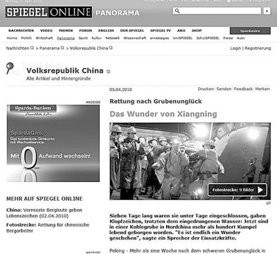 圖為德國《明鏡》周刊網站在顯著位置刊登我礦難救援奇跡的網頁。(圖片來源:光明日報)