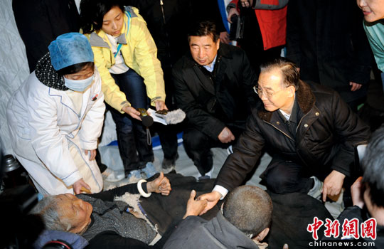 溫家寶是于今日下午6時(shí)乘專機(jī)抵達(dá)青海玉樹(shù)的,隨即他乘車前往地震災(zāi)區(qū),察看災(zāi)情,看望慰問(wèn)救災(zāi)群眾,指導(dǎo)抗震救災(zāi)工作。