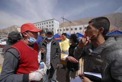 他的名字叫高樹友。在現(xiàn)場負責(zé)招募志愿者的玉樹團州委干事扎西告訴我,地震發(fā)生后幾小時,滿身是土的高樹友跑來了,找到我們要求當(dāng)志愿者。“當(dāng)時現(xiàn)場還很亂,我們隨便找了一張紙,高樹友寫下了第一個名字”,扎西從桌上拿出一個寫滿名字的紙說:“就是這樣的紙,現(xiàn)在已經(jīng)寫滿幾十頁,有400多人報名了,地震當(dāng)天有30多個。高樹友不僅是第一個報名,而且?guī)椭覀兘M織志愿者,這個招募點就是我們一起搭起來的。”