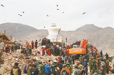 愿意在風雪中進行一次短暫巡視的人到處都能看到這樣的景象:騎著缺了車燈的摩托車的藏族漢子一臉倦容,他怕家人牽掛而備感焦急,但還是會對外來的人擠出一絲微笑;5個年輕人——他們有的還只是高中生——正忙著把自家的廢墟扒開,搬出椅子、飯鍋或者其他可能還完整的東西。很難知道家里的大人在哪里,問起來,他們轉過頭去,一臉茫然的神情。