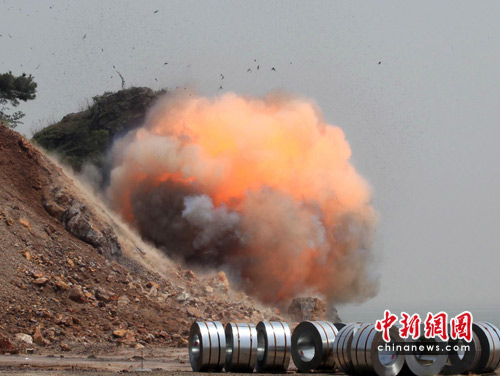 中新網(wǎng)九江4月28日電(胡國(guó)林 李濤淵)“一、二、三”,隨著一聲令下,4月27日中午,在江西九江都昌縣磯山湖附近一偏僻的時(shí)子山腳下,立即出現(xiàn)一個(gè)巨大的“火球”,原來,這里正在實(shí)施銷毀日軍侵華時(shí)期遺留下來的炮彈。