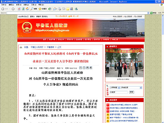 山西省朔州市平魯區(qū)人民政府對《山西平魯一價值數億元企業(yè)以一萬元賣給個人引爭議》報道的回應
