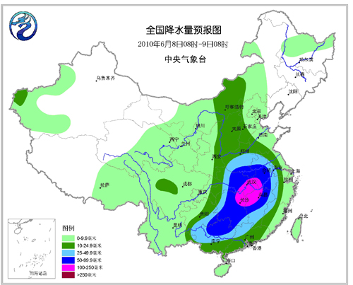 6月8日,西北地區(qū)中西部、內(nèi)蒙古西部和東部、東北大部等地為晴到多云天氣,日最高氣溫29~33℃,其中新疆盆地地區(qū)日最高氣溫可達(dá)35~37℃。我國其余大部分省(區(qū)、市)將有小到中雨,其中湖北、安徽南部、湖南、江西、浙江西部、福建西北部、廣東北部、廣西北部等地有大雨,部分地區(qū)有暴雨,湖北東南部、湖南北部、江西北部等地局地有大暴雨(圖2),并伴有短時(shí)雷雨大風(fēng)等強(qiáng)對(duì)流天氣,大部分地區(qū)日最高氣溫在24~28℃之間。
