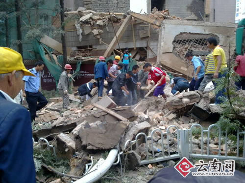 記者現(xiàn)場了解到,今天上午11時(shí)15分左右,云南飯店在拆遷過程中突然發(fā)生倒塌。靠東風(fēng)西路一邊正在被拆遷的一堵高大約7米的墻體砸向公交站臺(tái),一輛5路公交車正在站臺(tái)上下客,由于墻體離公交站臺(tái)非常近,正在下車的兩名乘客(一男一女)被砸傷。隨后,救護(hù)車迅速趕往現(xiàn)場,目前,兩名傷者均已被送往醫(yī)院搶救,傷勢尚不清楚。
