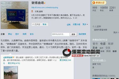 25日晚,云南省曲靖市馬龍縣遭遇特大暴雨,26日中午起,曲靖市委宣傳部部長(zhǎng)何華的個(gè)人微博及宣傳部官方微博——“微博曲靖”開始圖文直播馬龍災(zāi)情與救災(zāi)情況,在馬龍縣城電力、交通、通訊中斷幾成“孤島”的情況下,曲靖官方微博成為網(wǎng)友獲取第一手信息的來源。