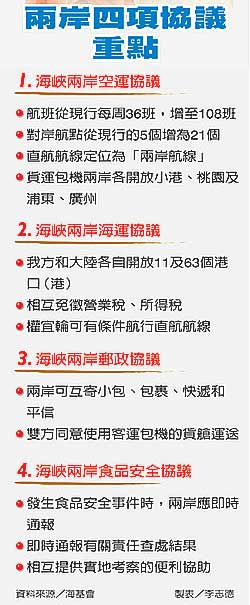 報(bào)道說(shuō),兩會(huì)副董事長(zhǎng)、副會(huì)長(zhǎng)層級(jí)協(xié)商昨天敲定空運(yùn)、海運(yùn)、郵件及食品安全等四項(xiàng)協(xié)議,今天將由海基會(huì)董事長(zhǎng)江丙坤及海協(xié)會(huì)會(huì)長(zhǎng)陳云林舉行二次江陳會(huì)談,簽署協(xié)議。其中空運(yùn)、海運(yùn)、郵件等三項(xiàng)協(xié)議在簽署四十天后生效,食品安全協(xié)議在七天后生效。
