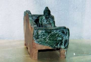 1、床:該床尺寸:長20.5cm,高:14cm,寬:12cm。從造型看漢代床的特征極為明顯。該床由三部分組成:床板,邊框,支架。該床為厚板與邊框護(hù)板相連。床面上刻有幾何形方格紋,又稱錢眼紋,泉源紋,即,古銅錢中心方孔紋飾。寓意睡臥錢眼,后輩有錢。床上邊框?yàn)樽蟆⒑蟆⒂胰娓咦o(hù)板組成。后護(hù)板中高、兩低。每塊護(hù)板上模印草花。寓意草繁茂盛。床板與邊框護(hù)板相連放在四腿支架上。四腿支架前后又有護(hù)板。前護(hù)板上三個(gè)方格內(nèi)有卷草模印圖案,后護(hù)板無釉無紋為黃泥土胎。