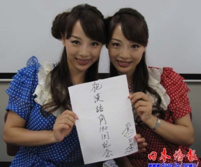 中新網(wǎng)7月21日電 據(jù)日本僑報(bào)報(bào)道,活躍在日本NHK電視臺(tái)漢語(yǔ)教學(xué)節(jié)目的中國(guó)湖北雙胞胎姊妹組合“鶯和燕”(中國(guó)名黃鶯、黃燕),7月19日在東京參加第二屆漢語(yǔ)節(jié)時(shí),特地來(lái)到日本僑報(bào)社的展位前,聽(tīng)取了該社創(chuàng)辦星期日漢語(yǔ)角的情況介紹。得知漢語(yǔ)角創(chuàng)辦三周年紀(jì)念大會(huì)將于8月8日在東京舉行時(shí),姐妹倆非常高興地題寫(xiě)了“祝漢語(yǔ)角150回”,表達(dá)她們對(duì)日本朋友學(xué)習(xí)漢語(yǔ)的支持。