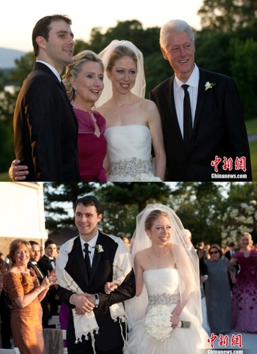 新郎麥文斯基與前總統(tǒng)克林頓則穿上英國品牌BURBERRY,希拉里選穿美國設計師品牌奧斯卡德拉倫塔量身打造的莓紅色禮服。