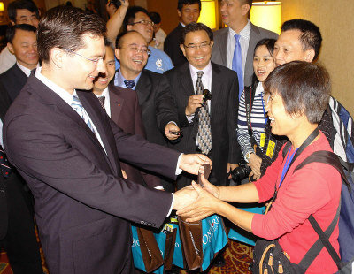 在與杜江等人會晤后,柏利文也代表哈珀總理,向首發團廣東中旅團員致贈紀念品,并一一握手問好、寒暄與交談。