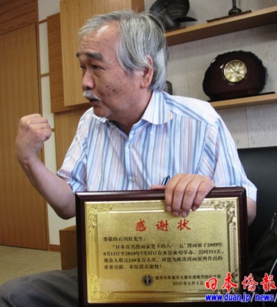 中新網9月2日電 據《日本僑報》報道,著名日中友好人士、前日中友好二十一世紀委員會日本委員石川好,日前收到侵華日軍南京大屠殺遇難同胞紀念館寄來的感謝狀,感謝石川好和日本漫畫家在該館成功舉辦“日本百名漫畫家筆下的8·15”展覽的事跡。