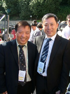 林朱慶臺長(左)和大陸主流媒體記者一起采訪溫總理外交活動