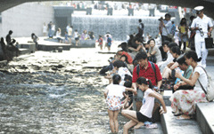 王某一家人從免稅店出來(lái)走向清溪川。清溪川是在中國(guó)也很有名的旅游景點(diǎn)。雖然是晚間時(shí)分,但天氣依然炎熱。王某的兩個(gè)兒子跳入水中。稍后而來(lái)的其他游客也脫掉鞋子進(jìn)入水中。一位游客說(shuō):“很涼快,很舒服。孩子們也很喜歡。在城市中心建設(shè)小溪,感到很羨慕!