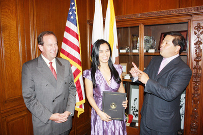 21日在市長辦公室國際廳代表舊金山接待韋唯的是市長辦公室國際貿易主任錢德勒 (Mark Chandler) 和灣區捷運董事方以偉。錢德勒表示,舊金山市府沒有頒發“榮譽市民”的慣例。市長紐森簽署的榮譽狀 (Certificate of Honor)就是對來訪者致敬的方式。紐森在榮譽狀上贊揚韋唯對美中兩國友好關系的貢獻,并對她來舊金山參加“同一首歌”表示榮幸。