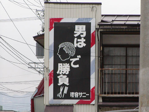 還有一回走過附近一家料理店,上面貼出的紙頭上寫的是“為了強化腸胃,去熱海集體宿營!” 比這個更絕的是鄉下的一家理發店,上面寫的是“男人憑腦袋瓜分勝負”,而這個腦袋瓜沒用漢字寫,生往上畫了一個卷毛兒的腦袋瓜,