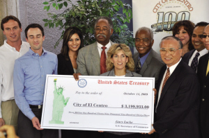 中新網10月16日電 據美國《僑報》報道,美國經濟蕭條還沒有走出低谷,聯邦財政預算捉襟見肘。14日在帝王郡艾爾森特市政府(El Centro, Imperial County)舉行頒獎典禮,聯邦商務部經濟發展局(EDA)表彰華裔開發商美國YK集團(YK America Group),對美國經濟和創造就業的貢獻,并獎勵給他們由商務部長駱家輝簽名的320萬美元支票,用于商業開發區水電和道路的基礎建設。