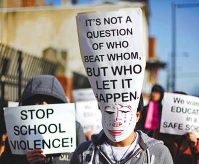 中新網1月8日電 美國南費城高中上個月初發生的非洲裔學生集體攻擊亞裔學生的事件,造成了26名學生受傷、其中7人須送醫治療,這引起各界關注,同時也使種族問題再被提及。據美國《華盛頓觀察》7日報道,此次校園暴力事件,學生抨擊是學校長期忽視校園種族沖突所致,因而罷課表達不滿。教育專家認為,學校和社會都應該更坦誠地談論種族問題,才能使青少年有正確的態度。